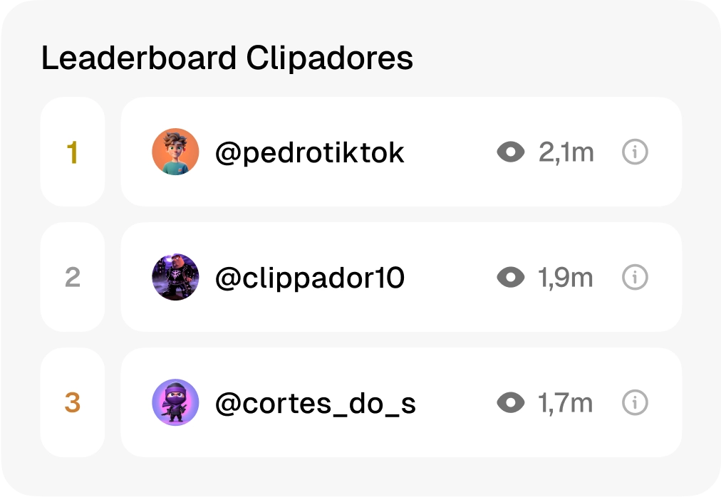Competições de cortes organizadas. Tracking via API do TikTok. Prêmios distribuídos na hora.